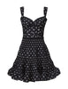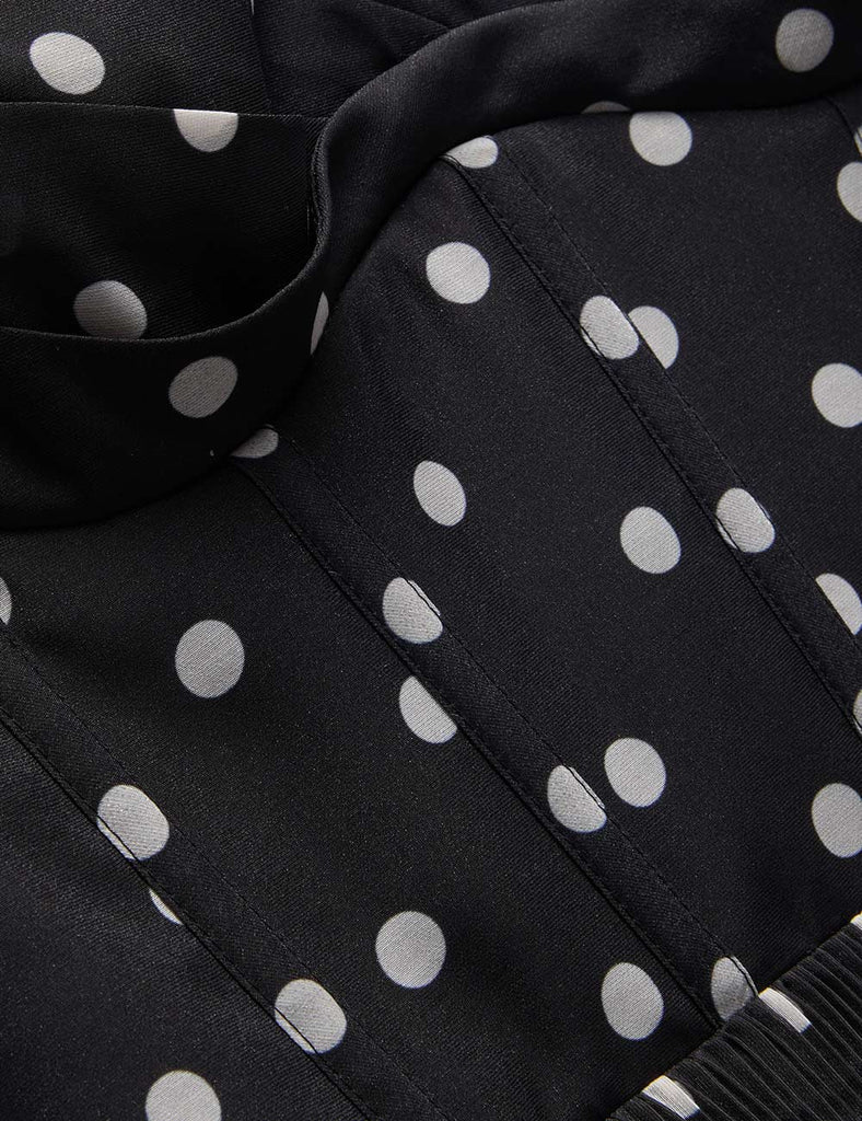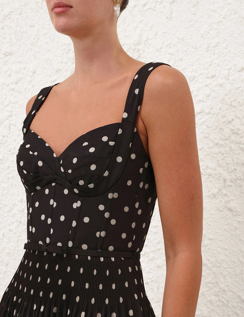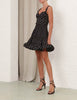 The Pleated Draped Mini Dress in Black Dot from our Spring 2026 Collection, Kindred Spirit. A mini dress featuring a fitted corset bodice, sweetheart neckline, fixed straps, finished with an invisible zip closure and heavily gathered skirt.