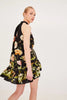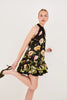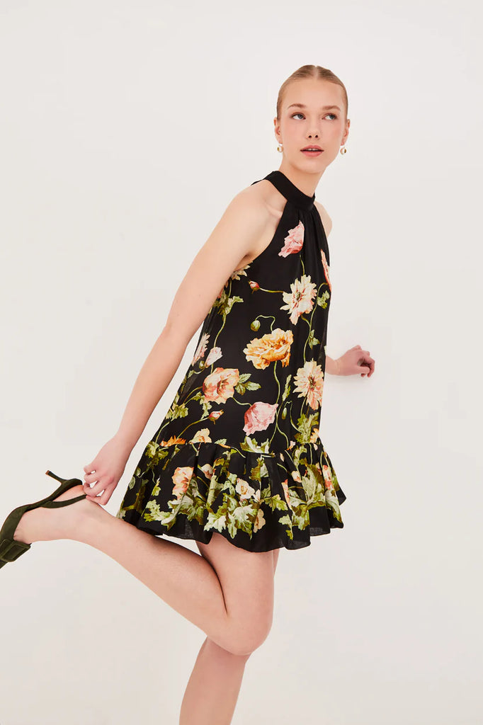 Mock-neck halter printed mini dress with a high-low hem and ruffled bottom tier
