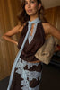Designed to be worn both ways, this top elevates any outfit! The tie fastenings in a gorgeous blue lace, that continues into the neckline, beautifully contrast the deep chocolate brown top making the piece feel super luxe and premium. Pair with the matching skirt of a chic co-ord or tone down with some scallop jeans and a heel.