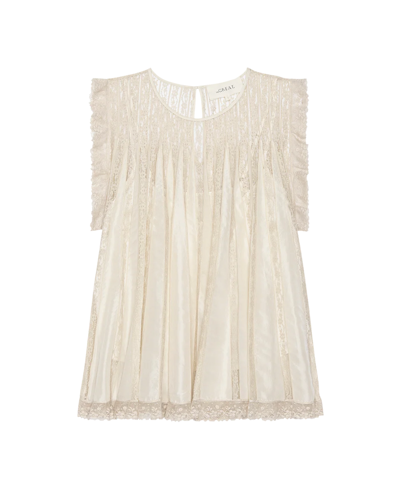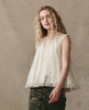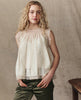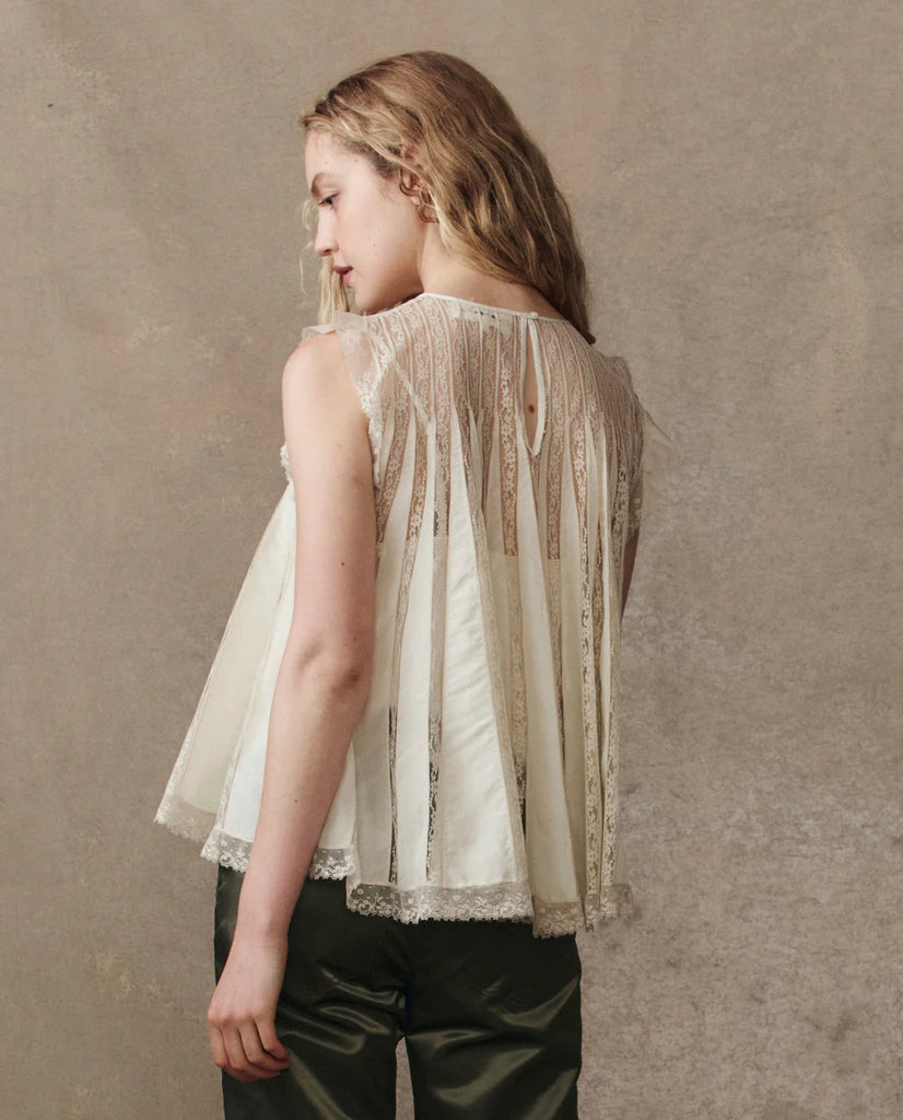 This airy sleeveless top is an ode to Victorian craft. Made from dainty lace intricately paneled with silk godets, it has a very swingy hemline that moves beautifully. The neckline is finished with silk binding and a keyhole button closure at the back. Sheer and romantic, it includes a separate camisole for ease and coverage. Size up for a more comfortable fit.