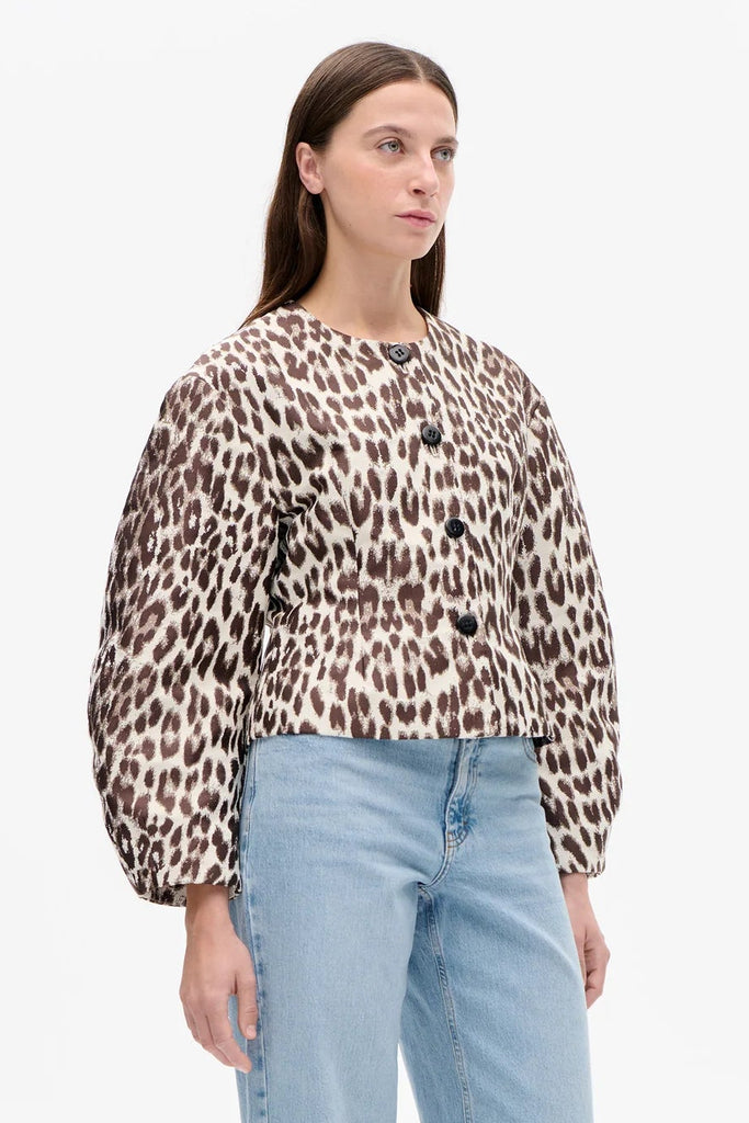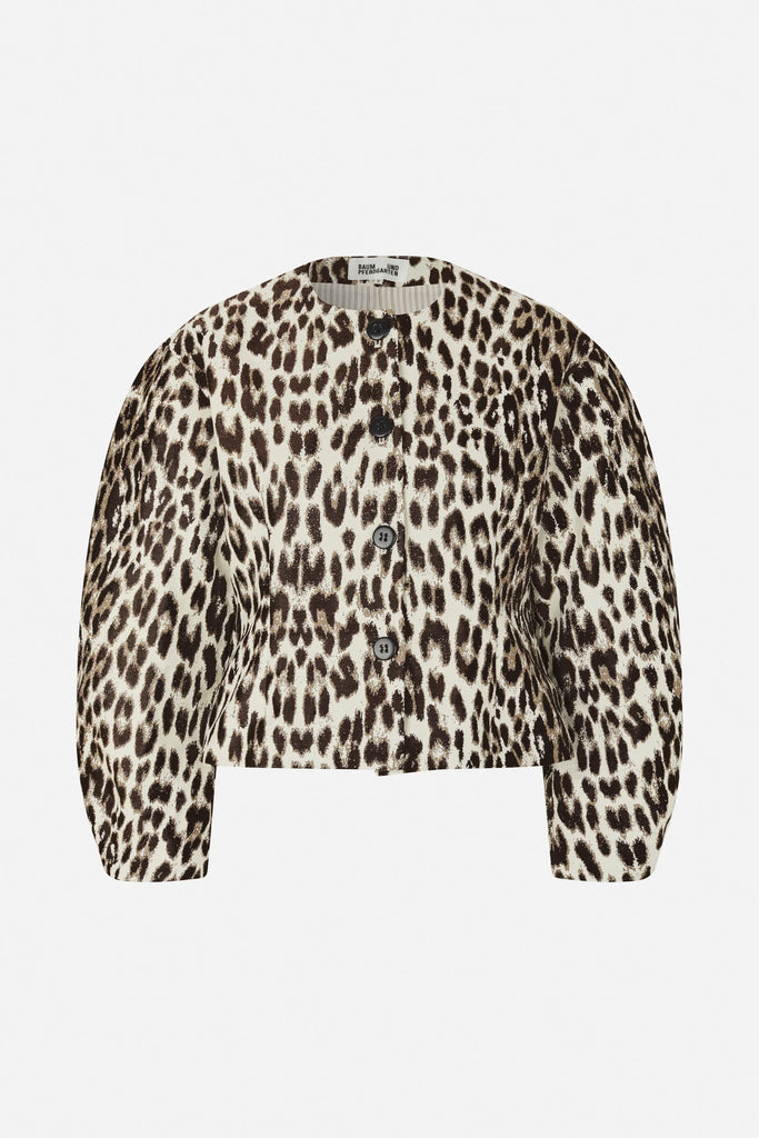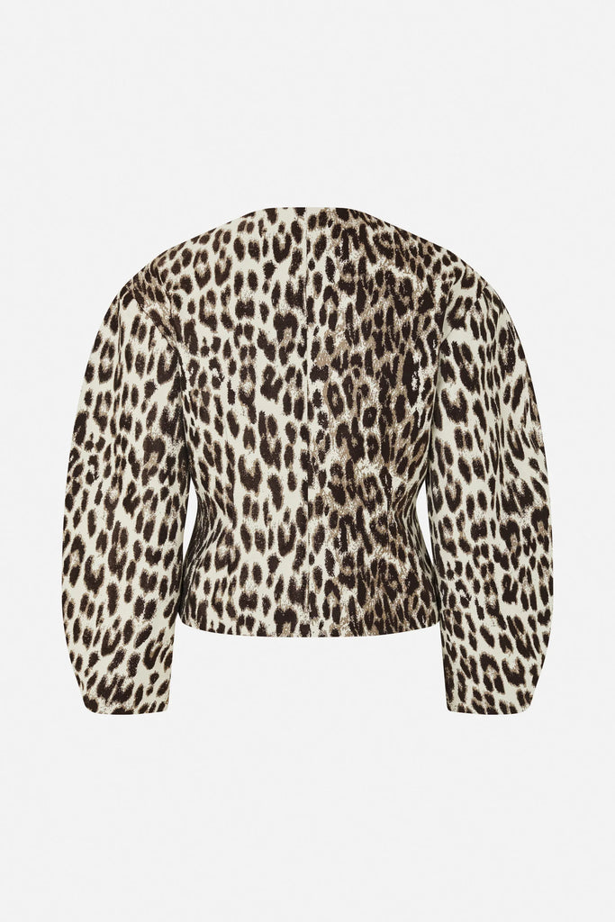 The Bonni Jacket is made in a cotton jacquard blend with a bold leopard pattern. Lined for comfort, the jacket has a relaxed fit, shaped at the waist, with dropped shoulders and wide, curved sleeves.