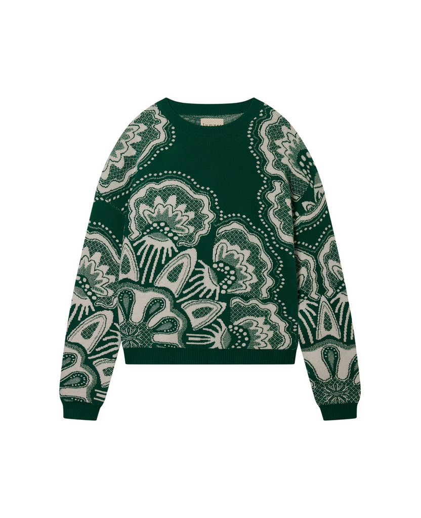 Jumper 1234 cashmere and wool jumper. A heavier weight cashmere and wool blend oversize crew neck with an amazing all over 'doily' jacquard pattern in green and fog. We know we'll be wearing this one on repeat!