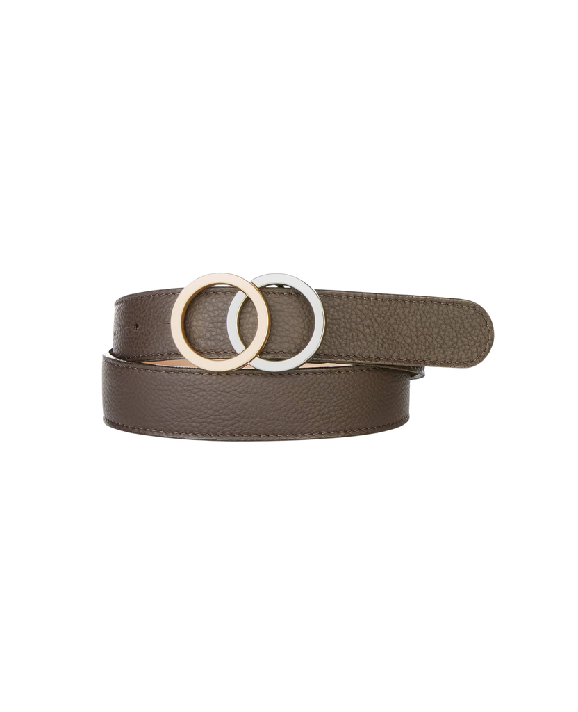 This perfect belt features a distinct double ring buckle in mixed metals. This statement piece is a great addition to your favourite looks! Paired with our classic vegetable tanned pebbled leather.