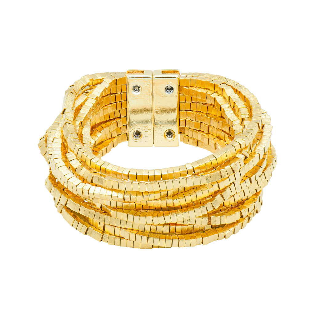 Nehara bracelet is made up of 18kt gold plate with stands of small square beads attached to a magnetic closure.
