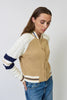This cardigan blends classic collegiate style with modern texture, featuring cable knit sleeves, a smooth structured body, and ribbed trim that delivers a polished, comfortable layer for everyday wear.
