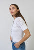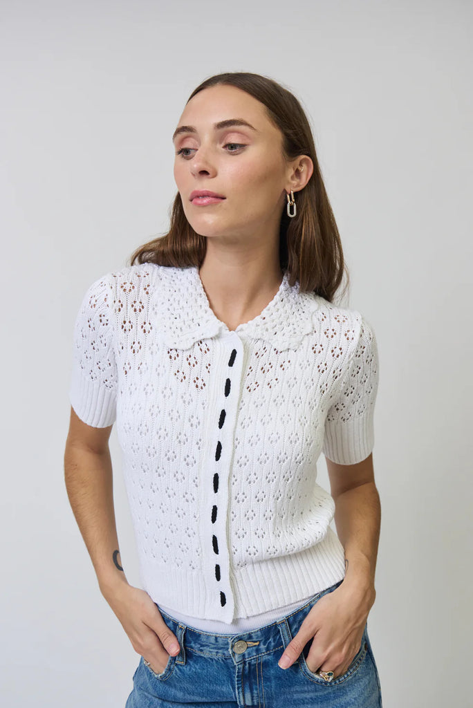 This knit top showcases an intricate pointelle pattern for a breathable, textured feel. Short sleeves and a ribbed hem create a structured, flattering silhouette, while a delicate collar and contrast front placket add vintage charm with a modern twist.
