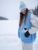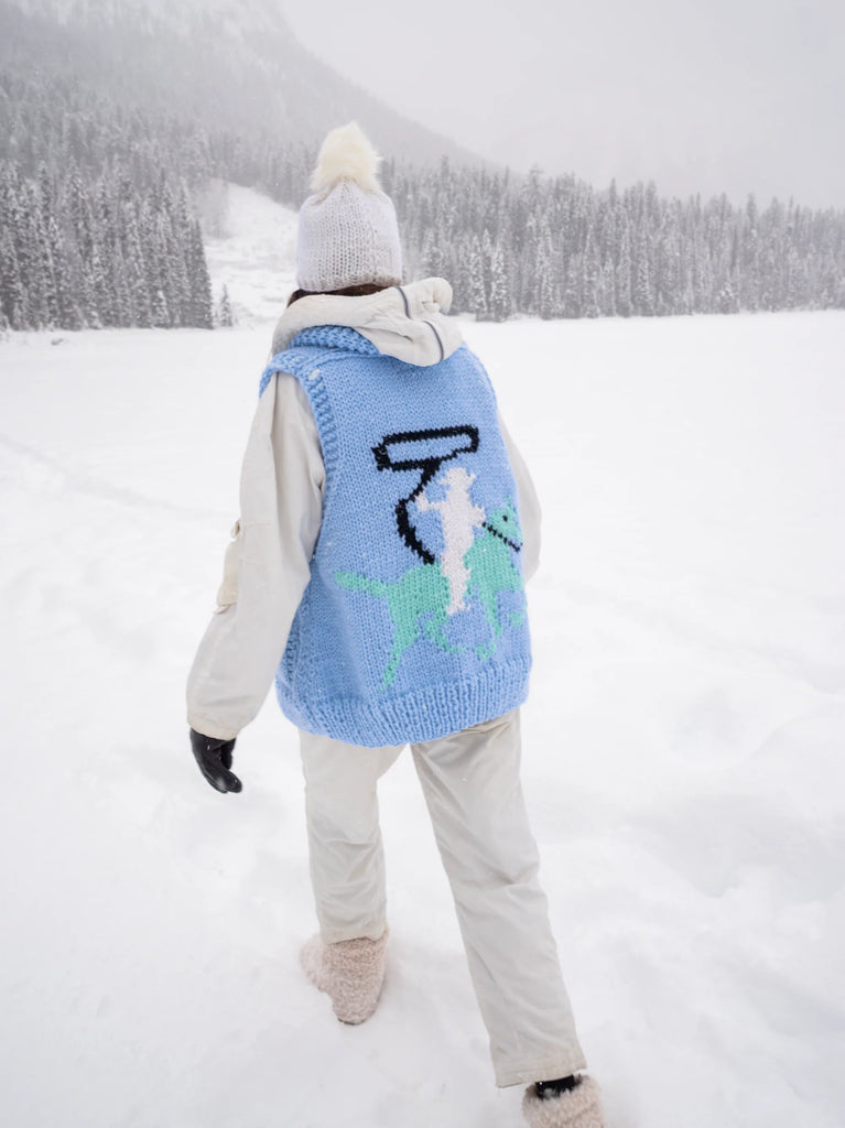 Building up the popular cowboy collection, this swing vest is a fabulous statement and conversation piece. Cowboy motif knit into the back and both front pieces. A-line body, side pockets, 3 porcelain buttons, shawl collar.