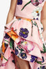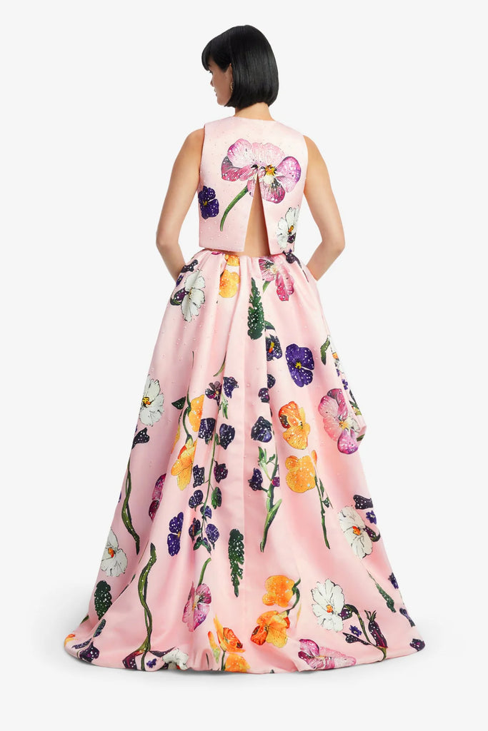 A playful scattering of detailed wildflowers in vibrant purple, orange, and white bloom across a delicate pink base. Sparkling, intricate, and bursting with whimsical charm.