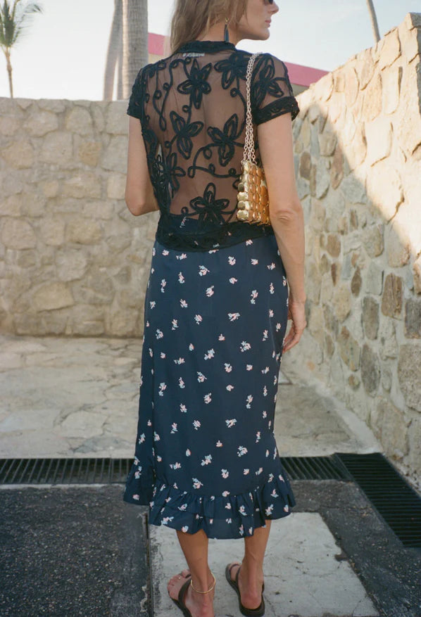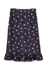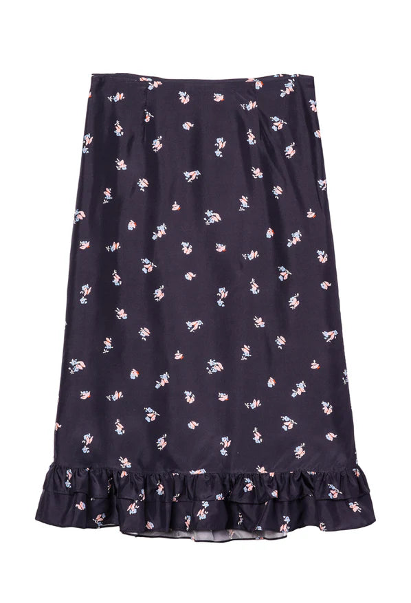 The Lilura Skirt in Papillon Silk is a women’s floral silk midi skirt with a mid rise fit, ruffled hem detailing, and a zip closure.