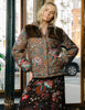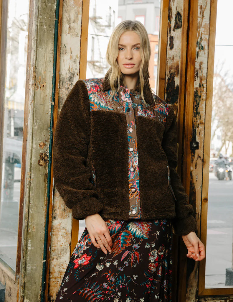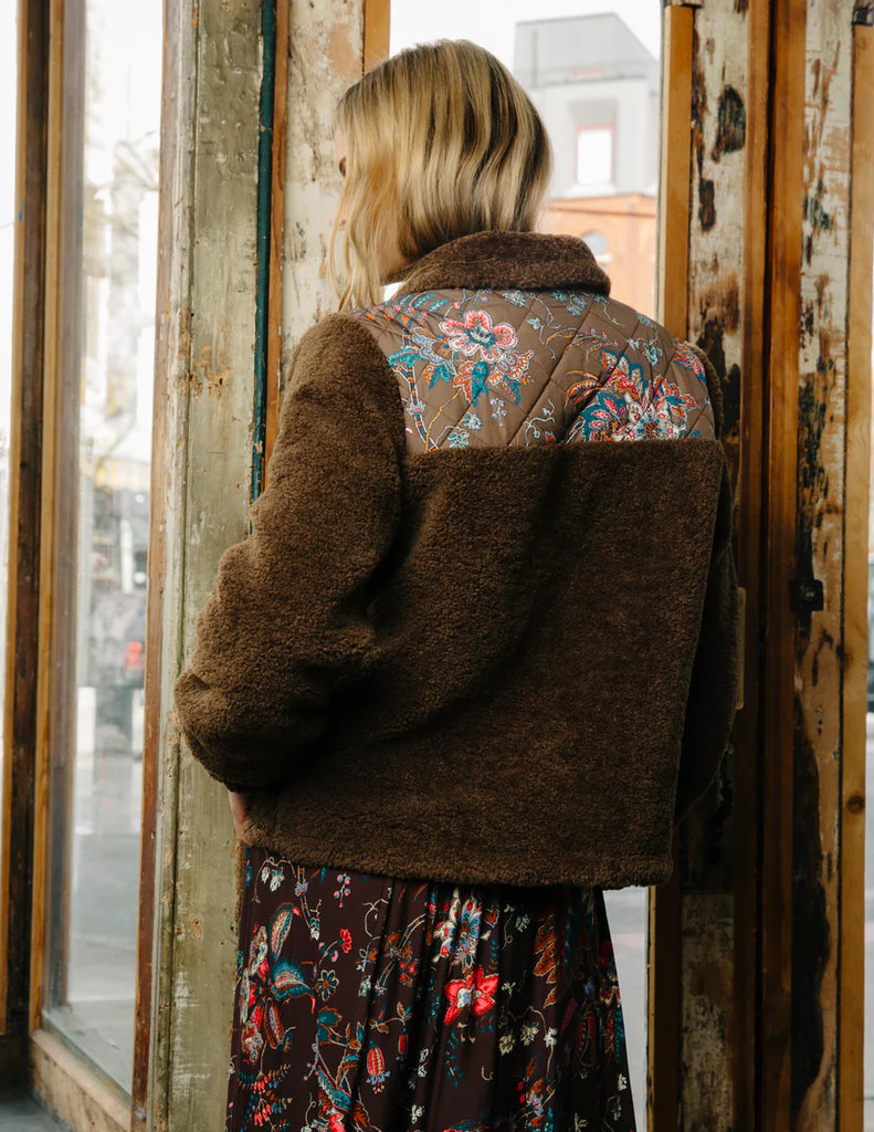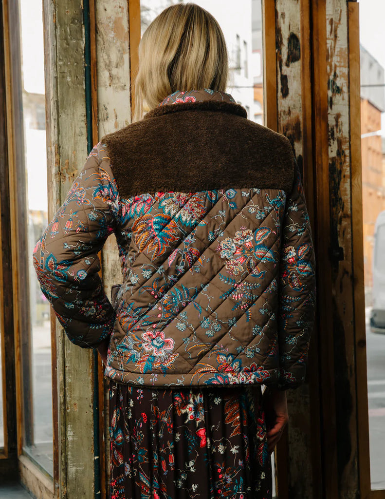 The new Reversible Finley Sherpa Jacket in Charlotte Floral Print features a rich chocolate-brown base with vibrant floral motifs. This quilted design is comboed with a plush rich chocolate brown faux shearling. Designed as a reversible jacket, it offers versatile styling.