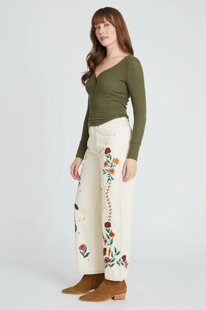The Elaine Barrel in Hazel Hallucination takes a fresh approach to modern denim with a barrel-leg silhouette that blends structure and ease. Crafted in a soft ecru wash, this style features our signature Hazel Hallucination embroidery — an intricate mix of florals, snakes, moons, and stars that adds an ethereal, storytelling element to the design.