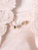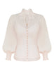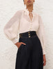 The Rebellion Collared Blouse in Cream from our Cruise 2026 Collection, Twisted Romance. A silk-linen blouse featuring a stand collar with lace trim, deep V-neckline and rouleau buttons down the centre front.
