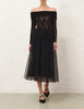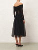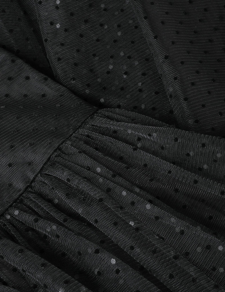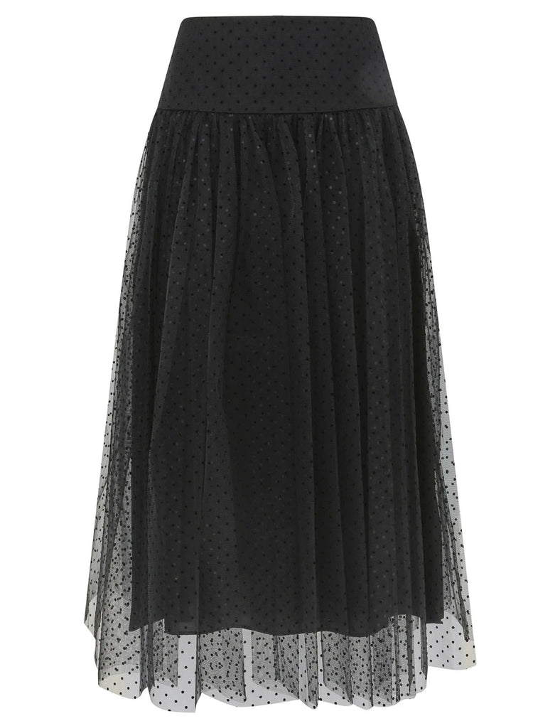 The Tulle Dot Midi Skirt in Black from our Cruise 2026 Collection, Twisted Romance. A midi-length skirt featuring a fixed waistband and an invisible zip closure, finished with patterned tulle overlay.