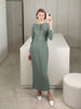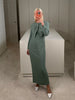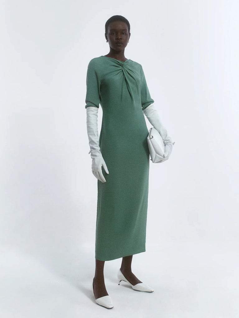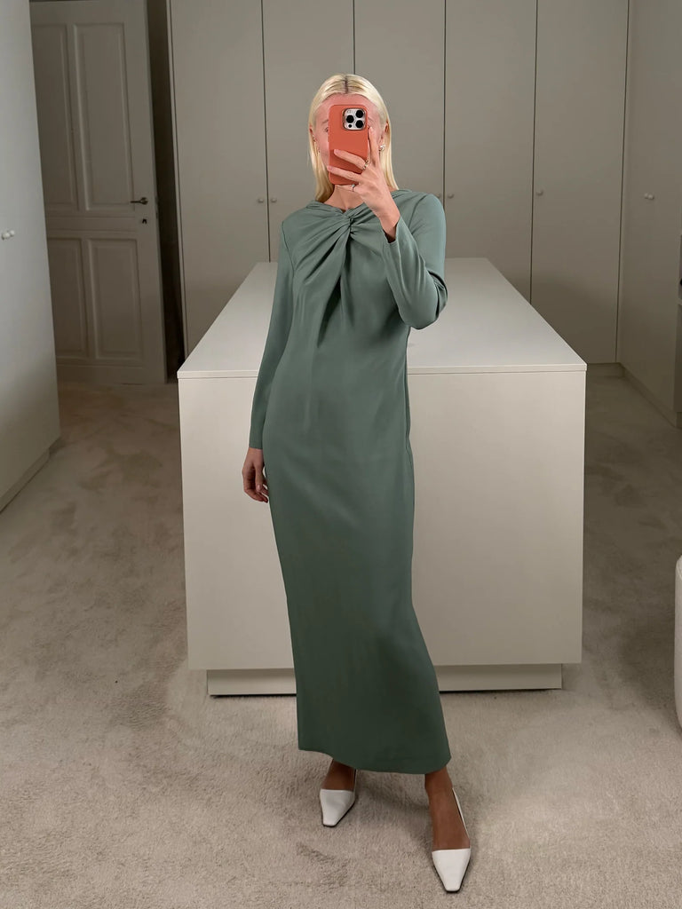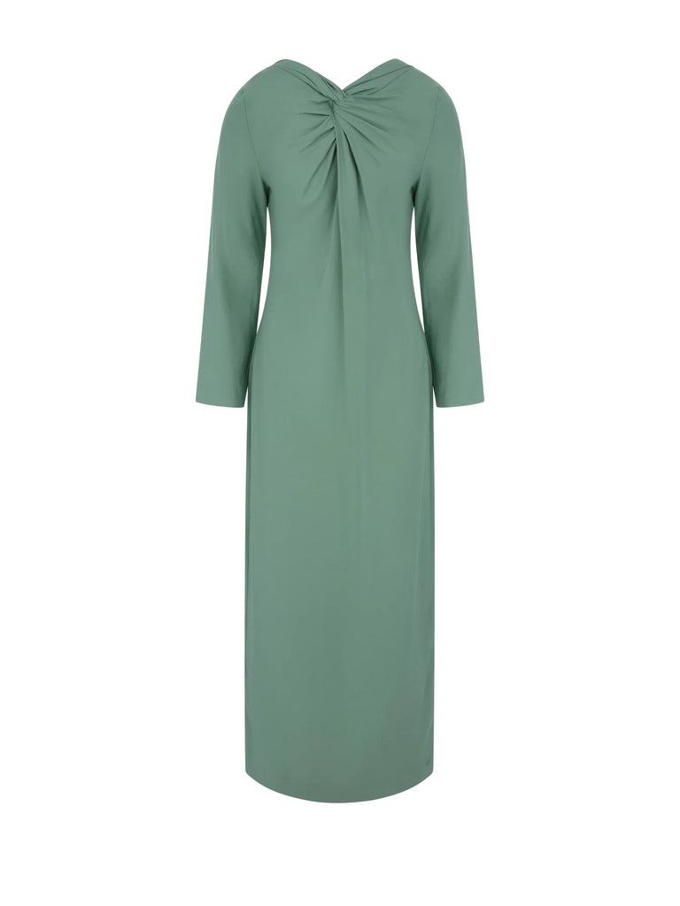Dress Lauren comes in a soft Sage Green, crafted from a fabric with a silk crepe-de-chine feel. This ankle-length gown features delicate straps and an elegant neckline, with a twisted knot detail at the bust that adds a refined touch.
