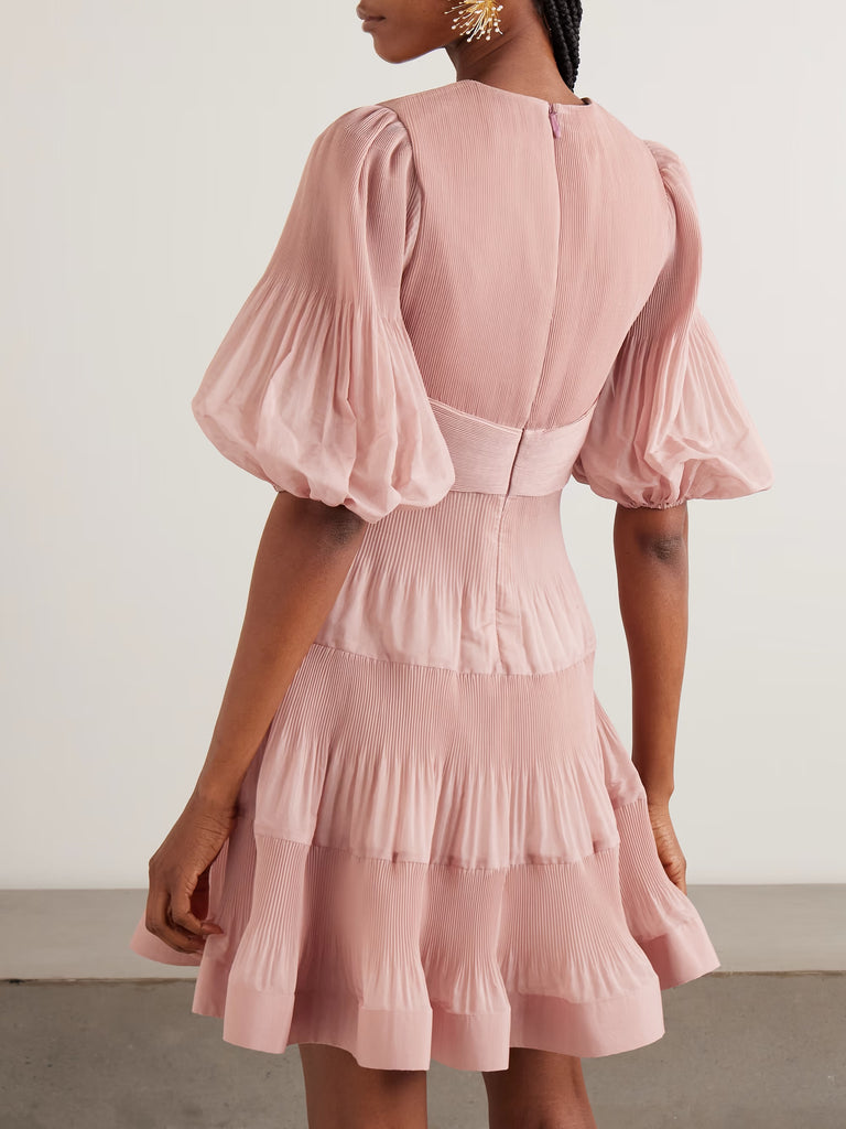 Zimmermann's mini dress is made from crisply pleated silk-organza. The bodice features a V-neckline, voluminous puffed sleeves and a cinched waist that opens into a tiered skirt. Wear it with ballet flats for a more romantic look.
