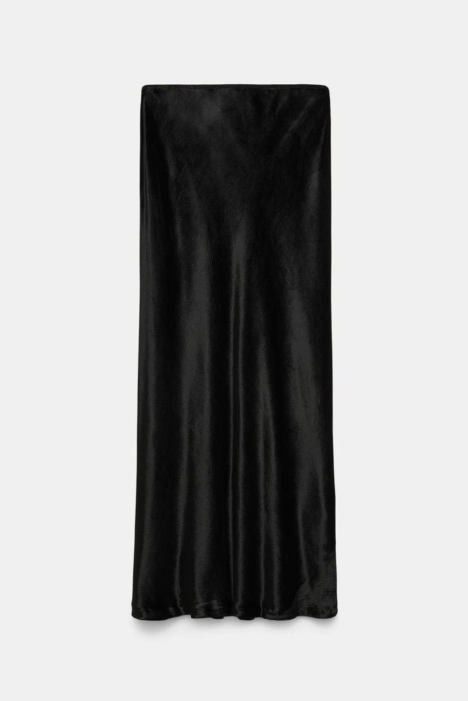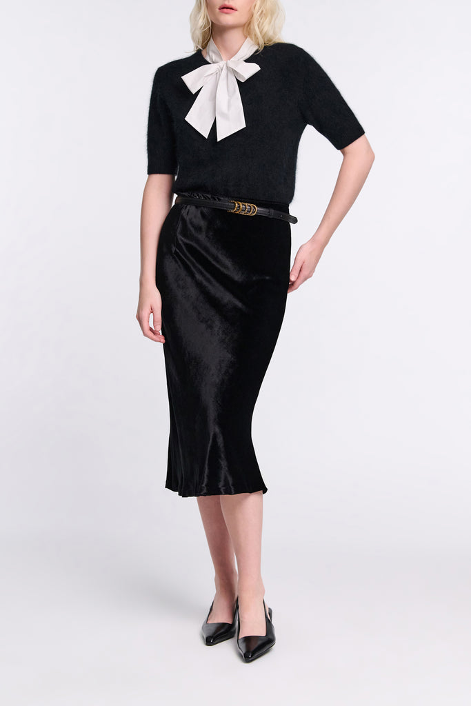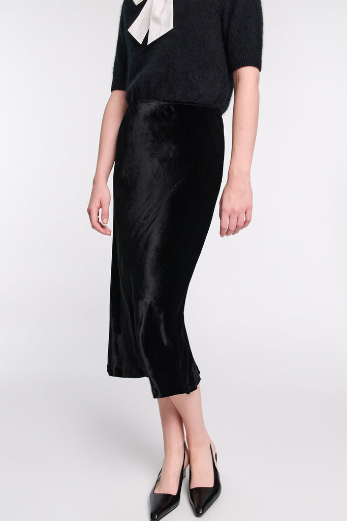 The bias-cut midi-skirt is styled in glossy velvet and has an elastic waist. The skirt can be worn as a set with the matching velvet collar blouse.