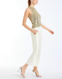 The Everly Knit Top in Sparkling Wine is a dazzling evening separate designed to bring shimmer and polish to your most glamorous looks. Crafted with an allover sequin finish, this racerback silhouette strikes the perfect balance between bold sparkle and versatile styling. Pair it with a skirt or sleek tailored trousers for evening soirées, holiday galas, or black-tie celebrations where shine is essential.