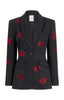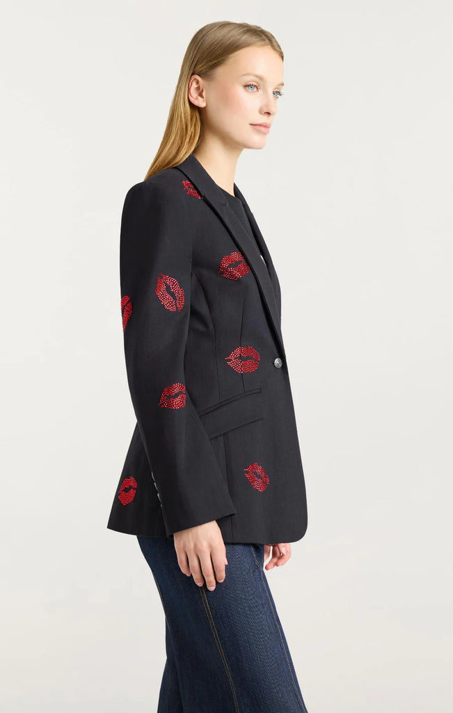 The Kissing Booth Cheyenne Jean Blazer is a tailored-fit blazer featuring sparkling rhinestone kiss details that add a touch of glamour to any outfit. Its sleek, structured design enhances your silhouette, making it perfect for stylish occasions or elevating everyday looks.