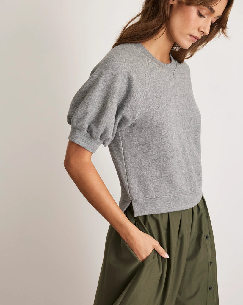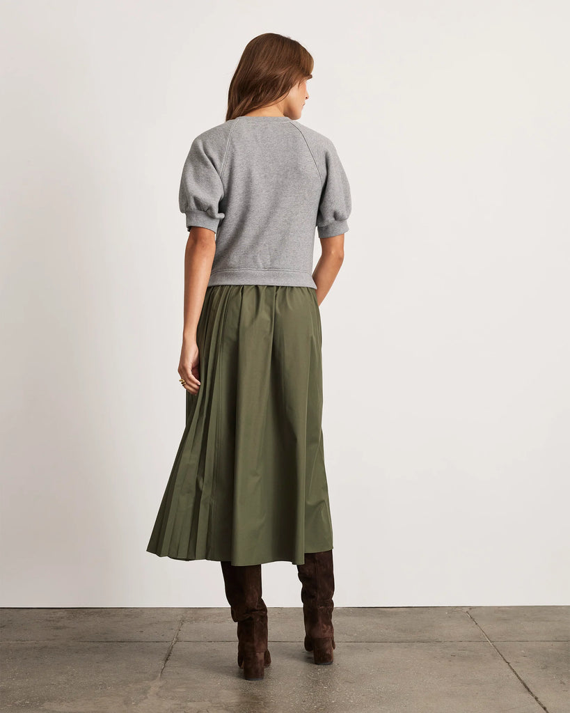 Featuring a short sleeve organic cotton french terry knit bodice overlayed on a cotton poplin skirt with side pleats and buttons, Shayna delivers the comfort of a knit while adding a playful poplin twist in this pre-styled midi dress.