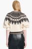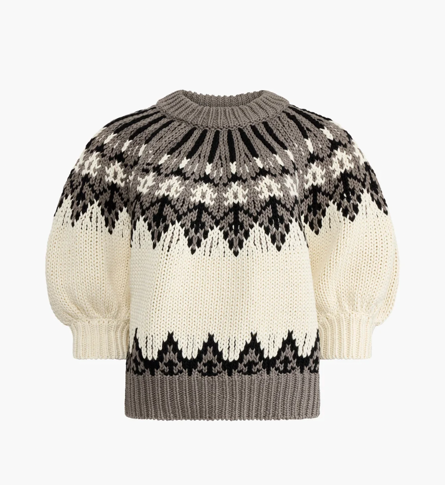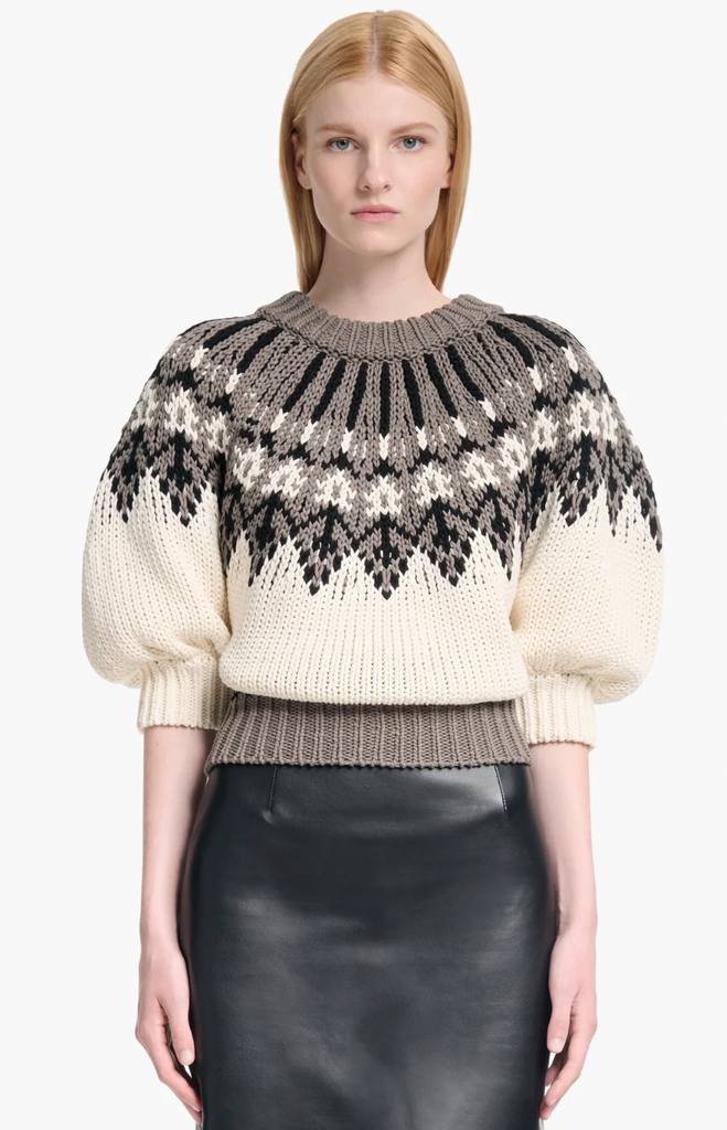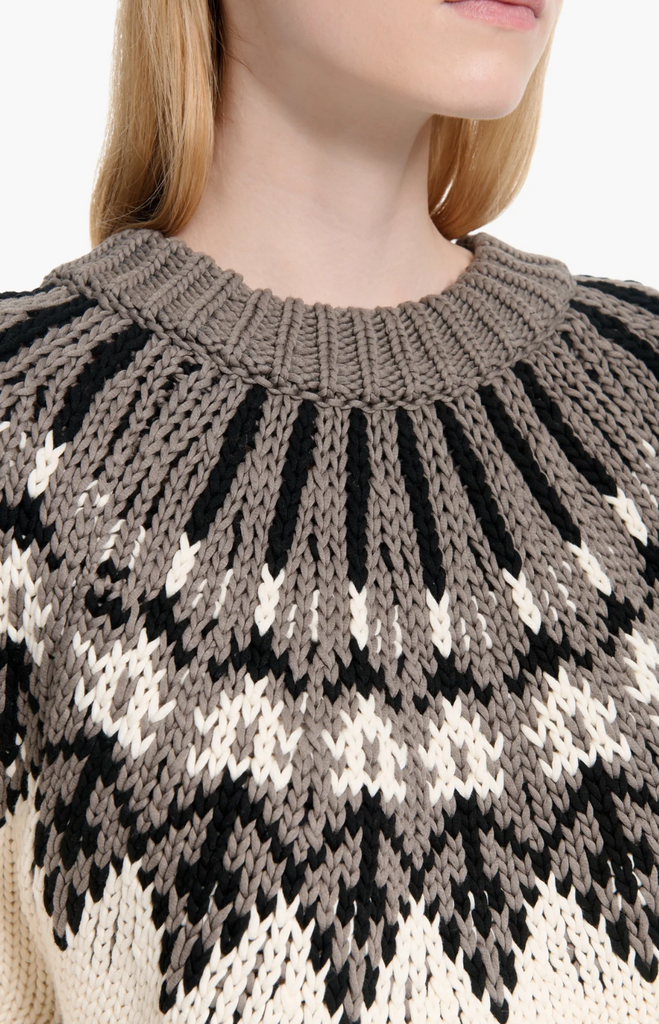 The Marty sweater is designed with a traditional Fair Isle pattern. Knitted from a soft Mako cotton, typically used for its exceptional fineness and silky feel, it's shaped for a looser fit with half balloon sleeves.